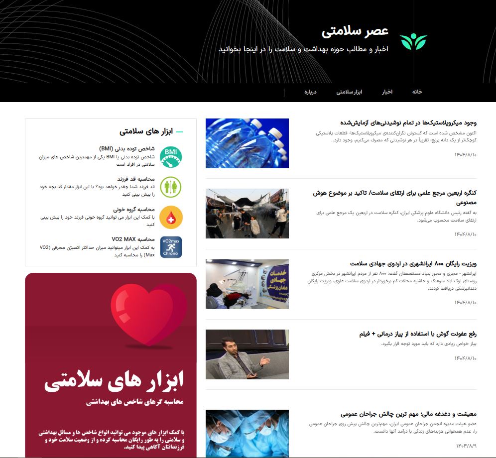 این وب سایت آخرین اخبار پزشکی، سلامت و حوزه بهداشت و درمان در اختیار مخاطبین خود قرار میدهد. ابزار های رایگان و آنلاین آن مانند محاسبه BMI، محاسبه حداکثر اکسیژن مصرفی، پیش بینی قد فرزند به شما کمک میکند تا وضعیت سلامت و بهداشت خود و اطرافیانتان را پایش کنید.